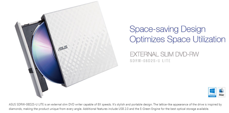 ASUS SDRW-08D2S-U LITE – portable 8X DVD burner with M-DISC support for lifetime data backup, compatible for Windows and Mac OS