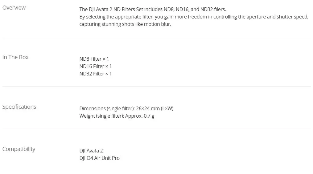 - Includes ND8, ND16, and ND32 filters