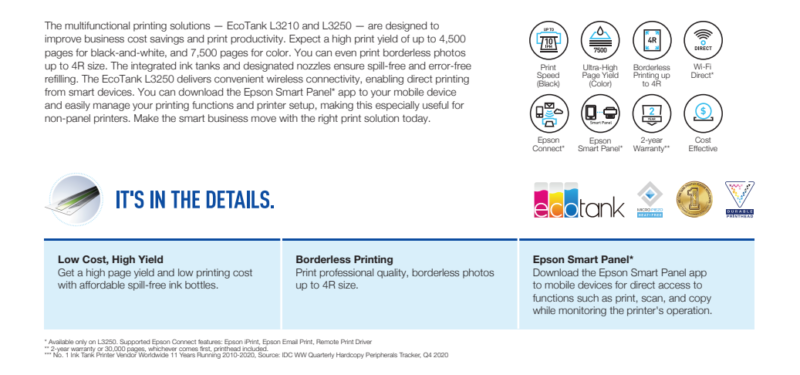 The multi-functional EcoTank L3250 is designed to improve business cost savings and print productivity. Expect a high print yield of up to 4,500 pages for black-and-white, and 7,500 pages for colour. You can even print borderless photos up to 4R size. The integrated ink tanks and designated nozzles ensure spill-free and error-free refilling. The EcoTank L3250 delivers convenient wireless connectivity, enabling direct printing from smart devices. You can download the Epson Smart Panel app to your mobile device and easily manage your printing functions and printer setup, making this especially useful for non-panel printers. Make the smart business move with the right print solution today.