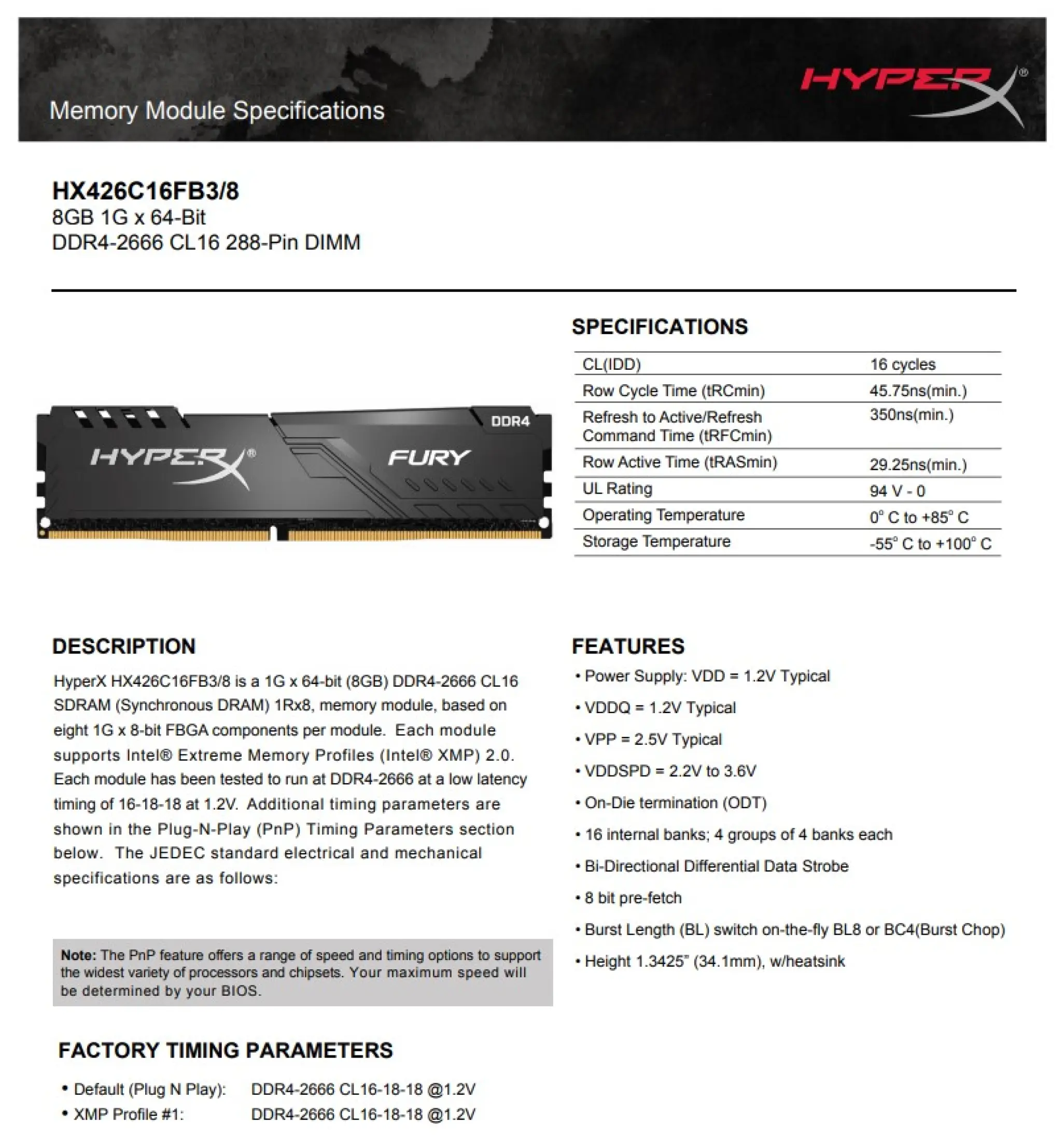 HyperX HX426C16FB3/8 is a 1G x 64-bit (8GB) DDR4-2666 CL16 SDRAM (Synchronous DRAM) 1Rx8, memory module, based on eight 1G x 8-bit FBGA components per module. Each module supports Intel® Extreme Memory Profiles (Intel® XMP) 2.0. Each module has been tested to run at DDR4-2666 at a low latency timing of 16-18-18 at 1.2V.